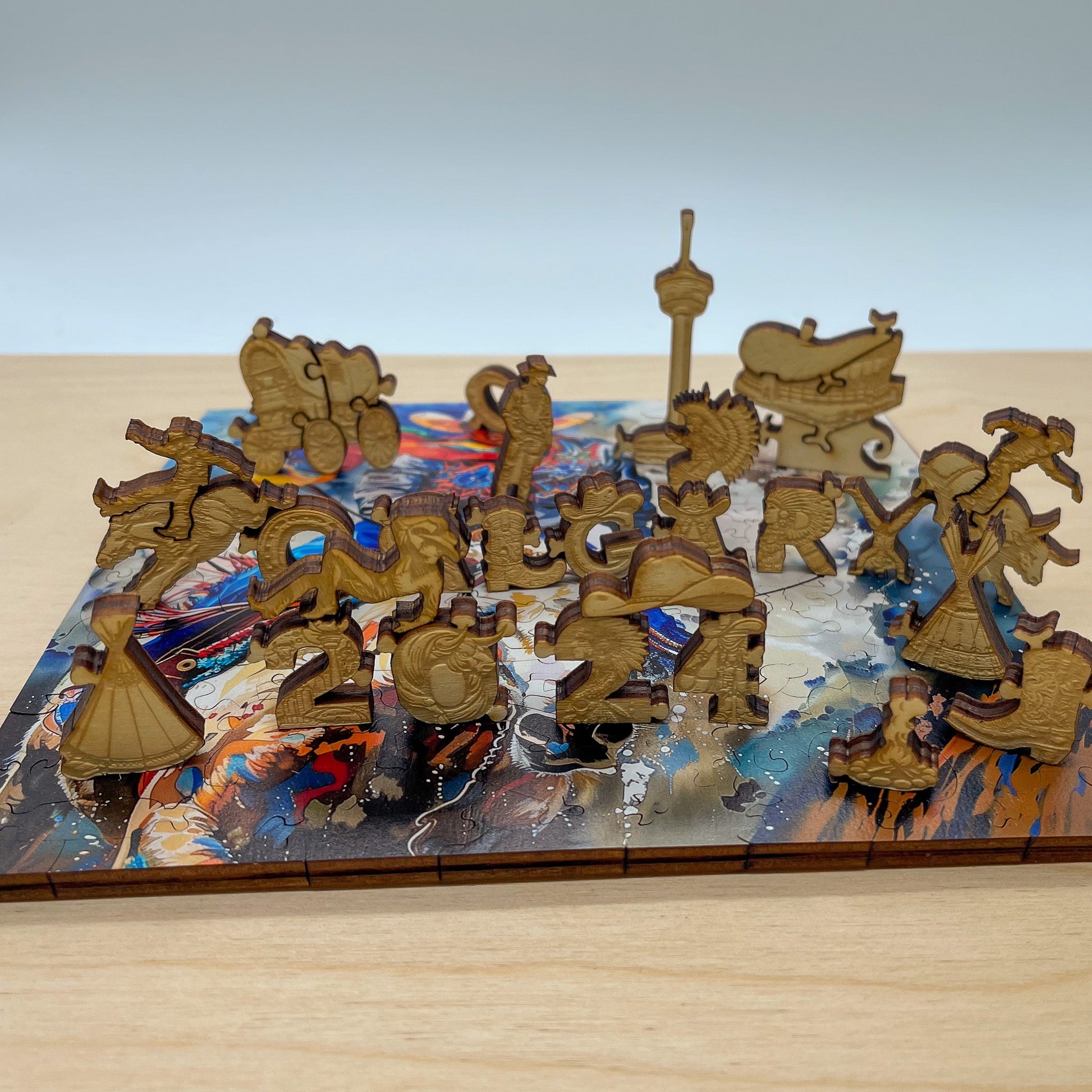 Flip the puzzle over to discover a rich tapestry of Calgary’s heritage. The back side depicts a lively scene with cowboys, rodeo events, wagons, and Indigenous dancers among an Indigenous site. You’ll also find iconic Calgary landmarks such as the Calgary Tower and the Saddledome. The letters “Calgary 2024” are creatively designed, with each letter showcasing a piece of Alberta’s history, iconic places, and traditions.