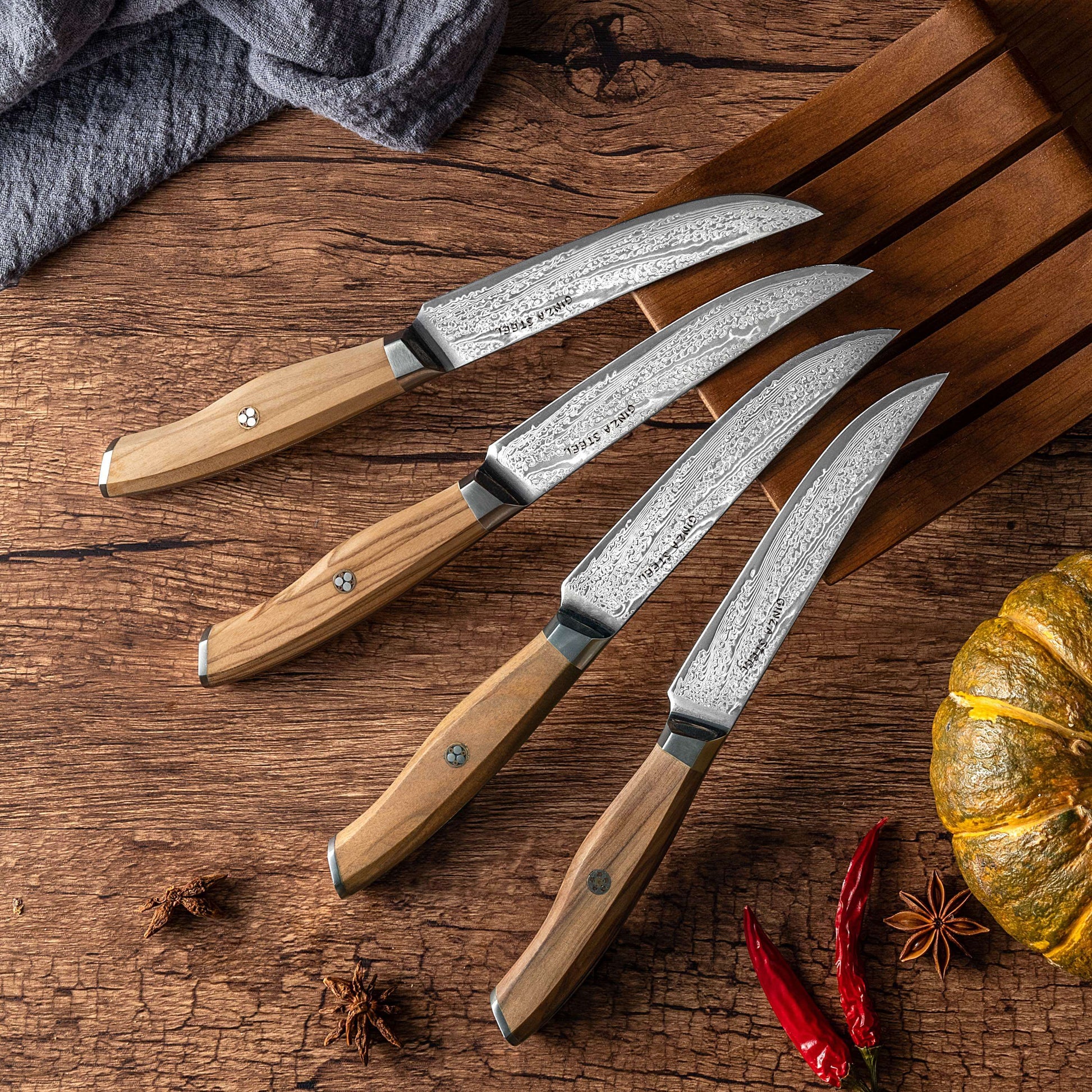 Ginza Steel AMELIA Five – 4-Piece VG10 Damascus Steel Steak Knife Set with Wood Block