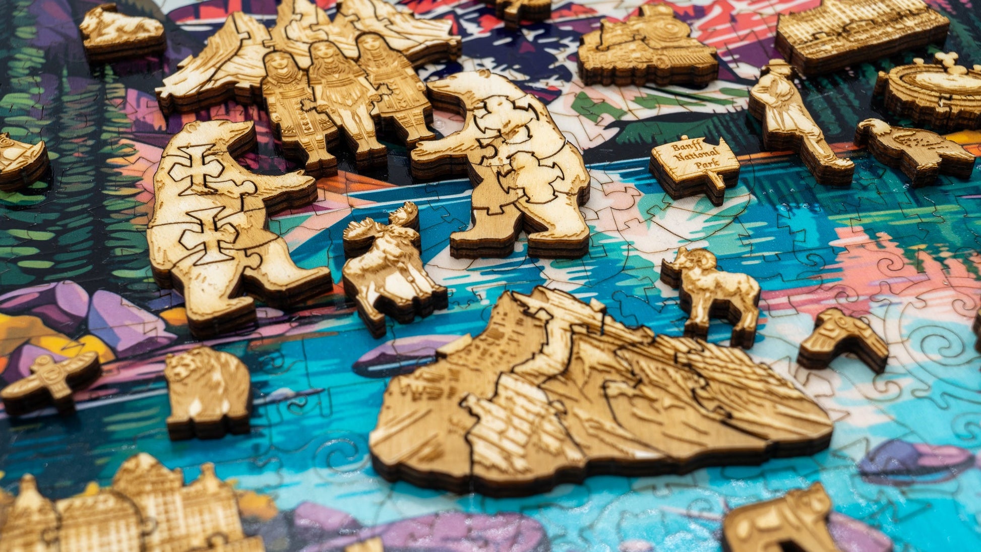 Flip the puzzle to discover the storied past of Banff National Park, beautifully depicted on the back side. This narrative-rich panorama traces the park’s evolution from its inception in 1885 after the discovery of thermal springs to its status as a beloved UNESCO World Heritage site. The design intricately blends significant historical milestones with depictions of the park’s flora and fauna, offering a visual journey through time. Each whimsically shaped piece adds a layer of storytelling, illustrating pivotal moments and the diverse ecosystems within the park.