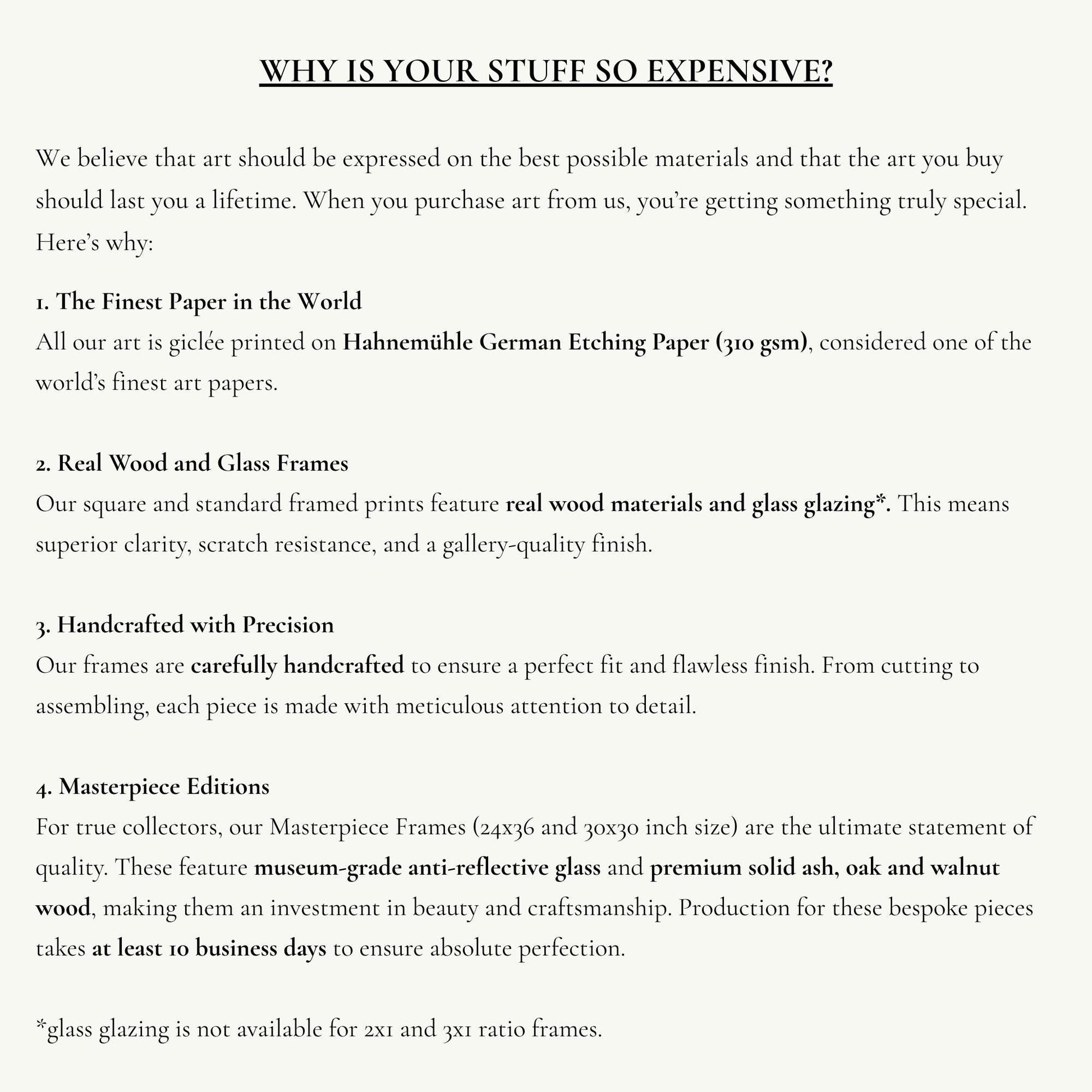 Masterpiece Frame (24x36 inches and 30x30 inches): The ultimate collector’s edition, designed to be a striking centerpiece. Handcrafted with premium solid wood, featuring museum-grade, anti-reflective glass for unparalleled clarity and protection. Bespoke craftsmanship to meet the highest standards of fine art presentation. Processing Time: At least 10 business days.